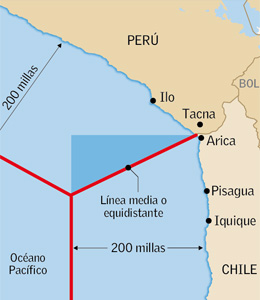 El país vecino solicita 38.324 Km2 de zona marítima y 37.610m2 de territorio continental. Chile argumenta que los límites actuales están fijados mediante Tratados Internacionales vigentes.