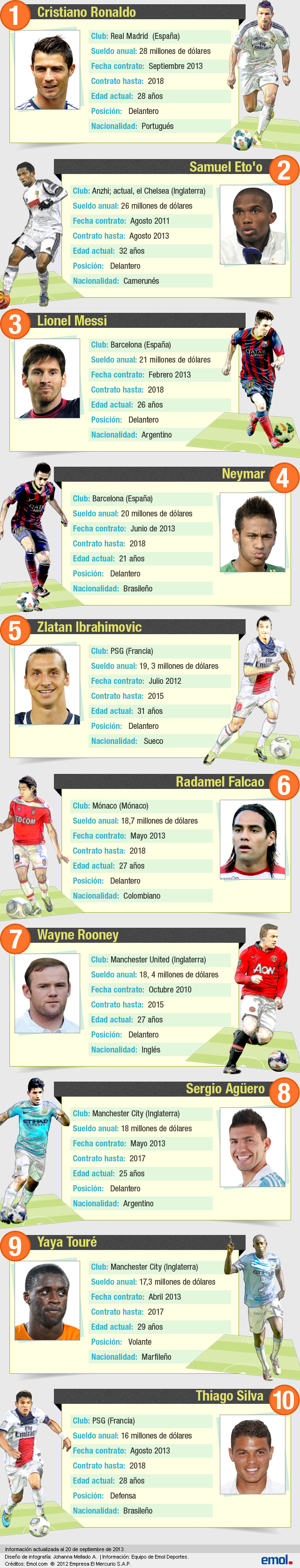 Tras la renovación de su contrato, el portugués Cristiano Ronaldo pasó a encabezar el listado que hasta el pasado fin de semana comandaba Samuel Eto’o, tras su paso por el Anzhi ruso. Ocho del “top ten” son delanteros, cierran un volante y un defensa.