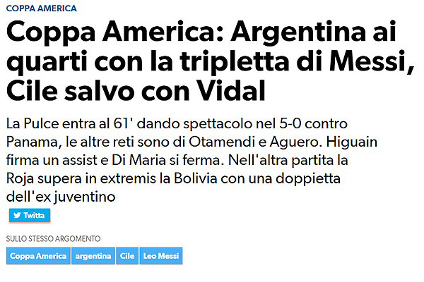 "Arturo Vidal rescata al campeón con polémica... La gran obra de Sampaoli parece no tener continuación sólo un año después de alcanzar la gloria. Con Pizzi, al mando de la nave chilena, nada se le parece. Son casi los mismos jugadores, pero el juego dista muchísimo de ser el que asombró al continente americano y al resto del mundo. Chile ya no enamora y su camino en la Copa América no debería llevarle muy lejos si no mejora sus prestaciones".