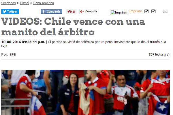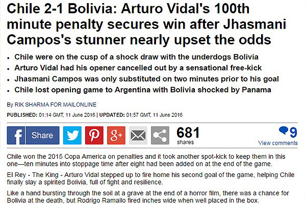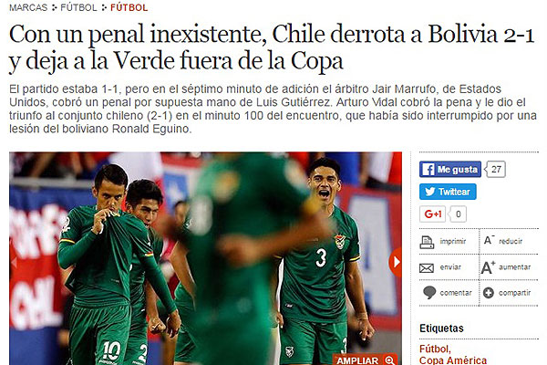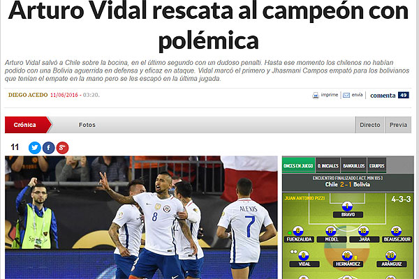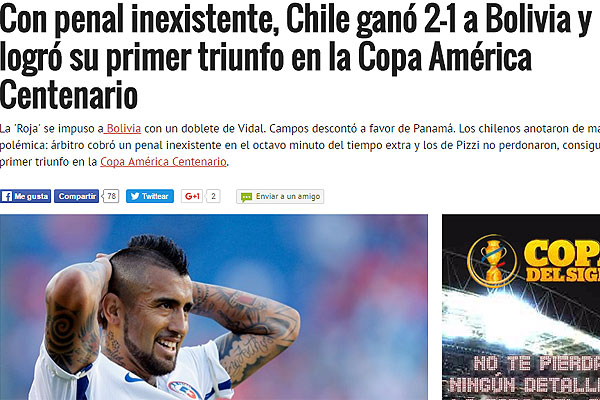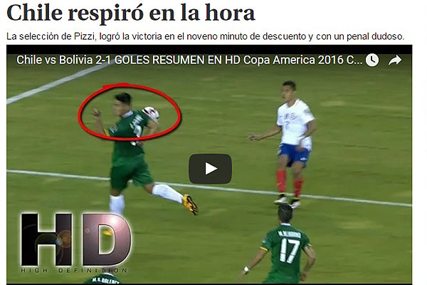 "Con penal inexistente, Chile ganó 2-1 a Bolivia y logró su primer triunfo en la Copa América Centenario... El reloj marcaba el minuto 98 y Bolivia esperaba el pitazo final, esto ante una insaciante marca de Chile. Por la derecha, Alexis Sánchez lanzó un nuevo centro y esta vez el balón pegó en el codo de un jugador altiplánico. Para sorpresa de todos, el árbitro Jair Marrufo pitó la pena máxima a favor de la 'Roja'".