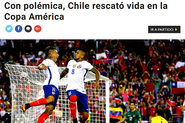 "Con polémica, Chile rescató vida en la Copa América... Cuando todo parecía que la Selección de Chile quedaría condenada a la eliminación pese al esfuerzo, y a pesar del dominio que manifestó en el segundo tiempo, un milagro con polémica de por medio dieron vida al combinado de Juan Antonio Pizzi al final del encuentro".