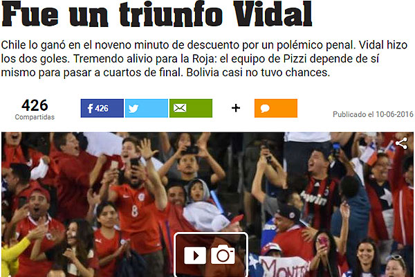 "Fue un triunfo Vidal. Chile lo ganó en el noveno minuto de descuento por un polémico penal. Vidal hizo los dos goles. Tremendo alivio para la Roja: el equipo de Pizzi depende de sí mismo para pasar a cuartos de final. Bolivia casi no tuvo chances. Para conseguir la ventaja la Roja necesitó de la ayuda arbitral... Chile ya sabe que no alcanza con un dominio avasallante. Ganó el partido en el que no se podía permitir perder puntos. Aunque está lejos de recibirse de candidato a bicampeón".