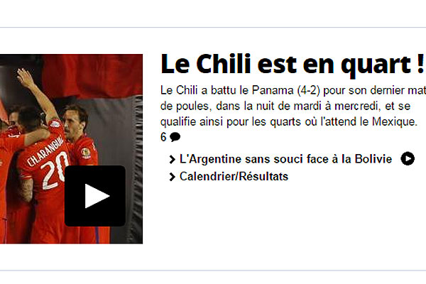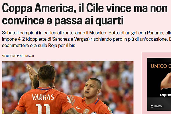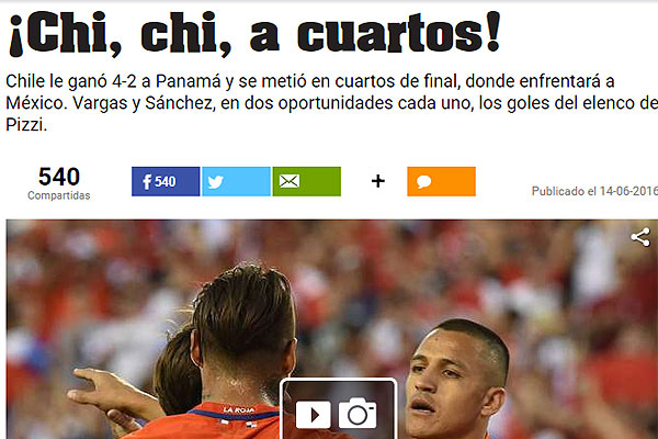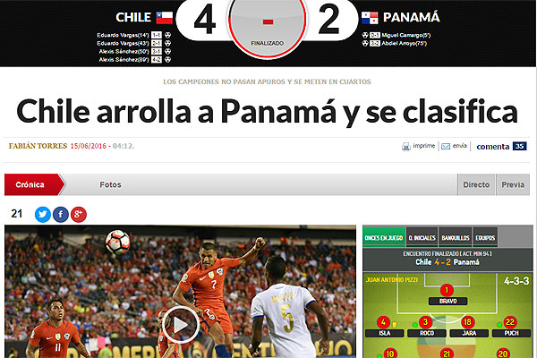 "Chile arrolla a Panamá y se clasifica. Si no fuese por los dos graves fallos de Claudio Bravo, culpable de ambos goles de Panamá, Chile no habría pasado demasiados apuros para clasificarse a los cuartos, a los que pasó dejando una muy buena imagen a pesar de que el rival ayudó, y mucho, para que la actual campeona se luciera durante los 90 minutos".