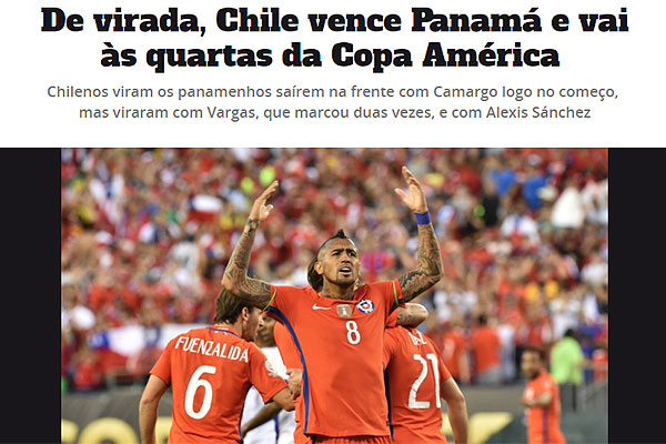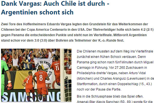 "Gracias a Vargas, Chile clasifica. Dos goles del delantero del Hoffenheim sentaron las bases para la próxima ronda de los chilenos en la Copa América Centenario en los EE.UU.. El defensor del título ganó en 4-2 a Panamá y sumó los puntos decisivos y ahora está en los cuartos de final".