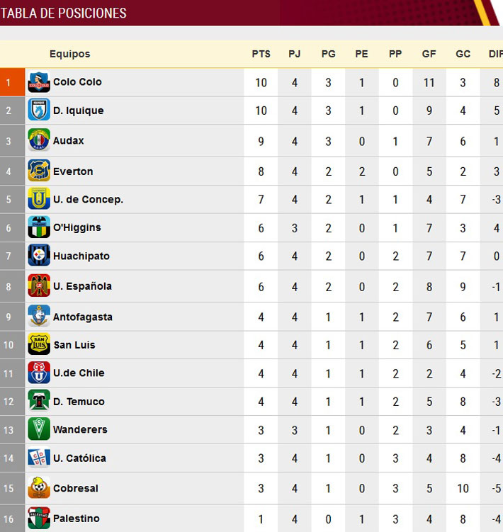 SANTIAGO.- No hubo muchas modificaciones en la tabla una vez finalizada la cuarta fecha del Torneo de Clausura 2016-2017, que ve nuevamente a un Colo Colo al tope de la clasificación.