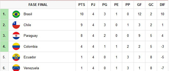 De esta forma, en la quinta y última jornada se definirá el título entre chilenos y brasileños y también se definirá a la selección que clasifique en el cuarto lugar. Colombia corre con ventaja, mientras que Ecuador y Venezuel se medirán en un duelo crucial para luego buscar el milagro.