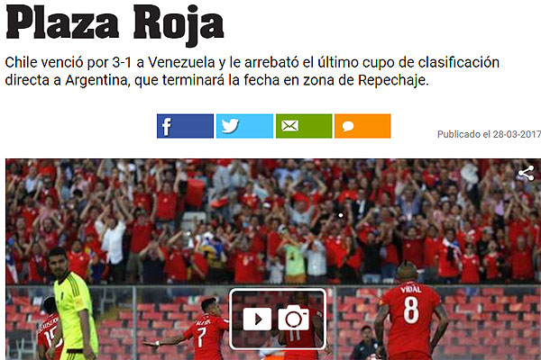 "Plaza Roja. Chile venció por 3-1 a Venezuela y le arrebató el último cupo de clasificación directa a Argentina. Salvo tramos esporádicos, Chile fue más de principio a fin y demostró que es un equipo cuando tiene a Arturo Vidal y otro sin él (menos mal que no estuvo el jueves pasado). Ante un rival que no fue medida, el equipo de Pizzi pegó tres cachetazos de entrada y luego reguló".