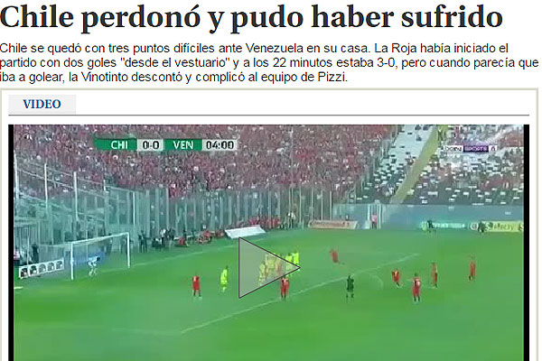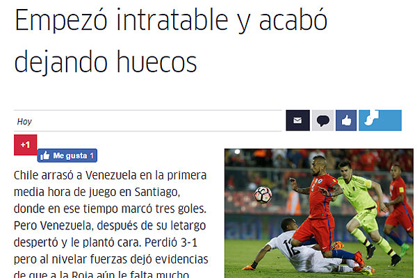 "Empezó intratable y acabó dejando huecos. Chile arrasó a Venezuela en la primera media hora de juego en Santiago, donde en ese tiempo marcó tres goles. Pero Venezuela, después de su letargo despertó y le plantó cara. Perdió 3-1 pero al nivelar fuerzas dejó evidencias de que a la Roja aún le falta mucho para convencer con sus resultados".