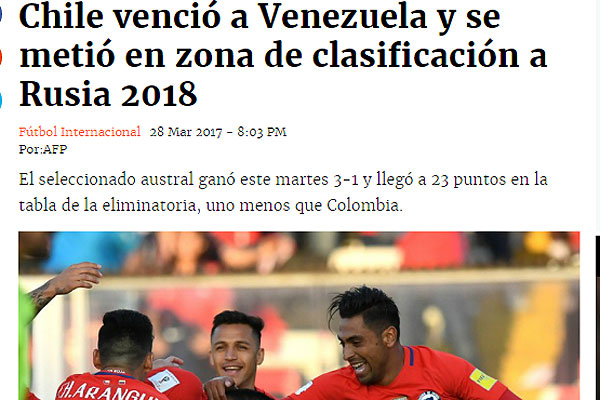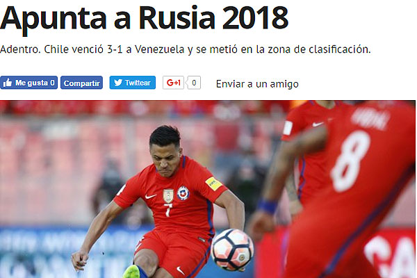 "Apunta a Rusia 2018. Adentro. Chile venció 3-1 a Venezuela y se metió en la zona de clasificación. A Chile le bastó ser contundente en la primera media hora para sentenciar el partido ante Venezuela, que despertó en el complemento pero ya era muy tarde para remontar. La selección que dirige Juan Antonio Pizzi acaba esta fecha doble en la cuarta posición, zona de clasificación directa a Rusia 2018".