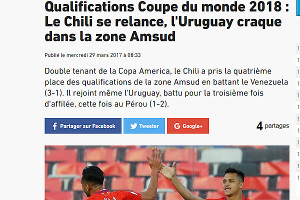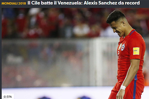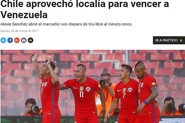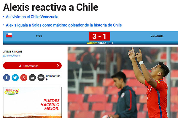 "Chile venció a Venezuela y se metió en zona de clasificación a Rusia 2018. Con un estadio Monumental de Santiago teñido con el rojo de las camisetas locales, Chile tuvo un inicio perfecto. Alexis bailó sobre el césped y abrió la fiesta colgando del ángulo un tiro libre para poner el 1-0 en el amanecer del duelo. Un gol que le permitió al delantero del Arsenal inglés igualar con 37 tantos a Marcelo Salas como máximo anotador históricos de la selección chilena".