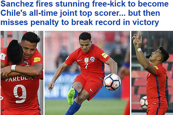 "Sánchez dispara impresionante tiro libre para convertirse en máximo goleador de todos los tiempos de Chile ... pero luego pierde penal. Afortunadamente para los locales, el fracaso del penal fue luego que Esteban Paredes anotara un doblete que le permitió a Chile los tres puntos y meterse en zona de clasificación".