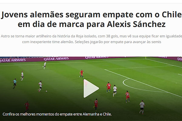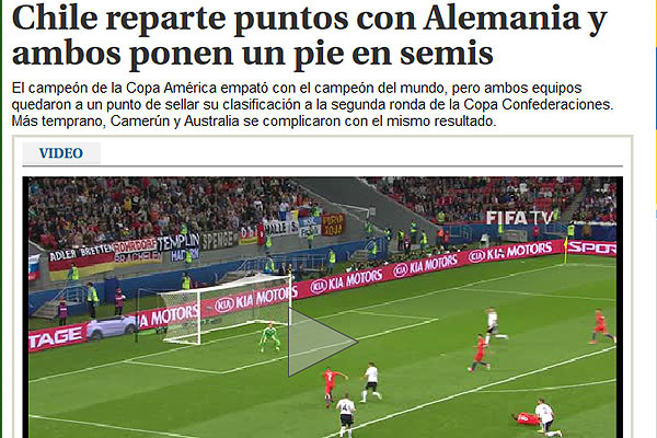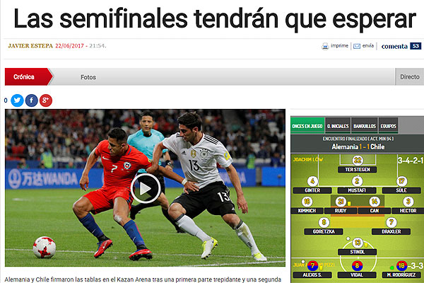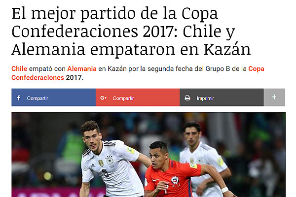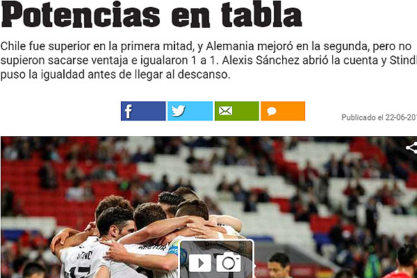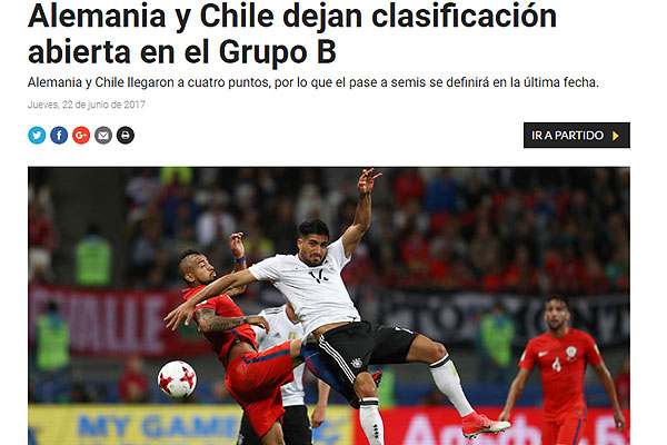 "Chile reparte puntos con Alemania y ambos ponen un pie en semis. El campeón de la Copa América empató con el campeón del mundo, pero ambos equipos quedaron a un punto de sellar su clasificación a la segunda ronda de la Copa Confederaciones. En el Kazan Arena, germanos y sudamericanos jugaron un partido demasiado táctico, dominado en la primera parte por Chile e igualado en la segunda con la participación de Marc-André ter Stegen en el arco de Alemania por decisión de Joachim Löw".