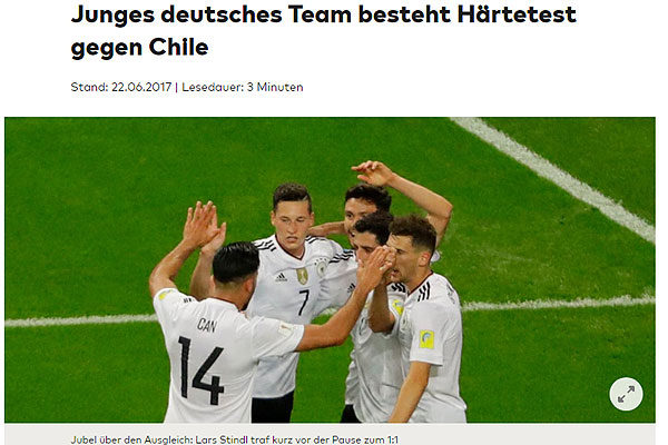 "Un joven equipo alemán pasó la prueba de resistencia más dura contra Chile. Ganó un valioso punto después de una salida en falso. Löw demostró gran respeto por el campeón de América del Sur y puso a cinco defensores. Fue la dura prueba esperada contra uno de los favoritos del torneo".