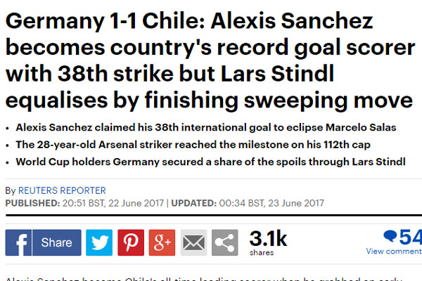 "Jóvenes alemanes rescatan empate ante Chile en día histórico para Sánchez. Los jóvenes representantes de los actuales campeones del mundo no se intimidaron y lograron controlar al experimentado equipo de América del Sur con un empate a 1-1. Chile mostró su intensidad desde el comienzo del juego. La presión en la salida alemana tomó cinco minutos para dar el resultado esperado: un error que dejó el balón en los pies chilenos. Vidal y Sánchez no dudaron y el 7 abrió el marcador".
