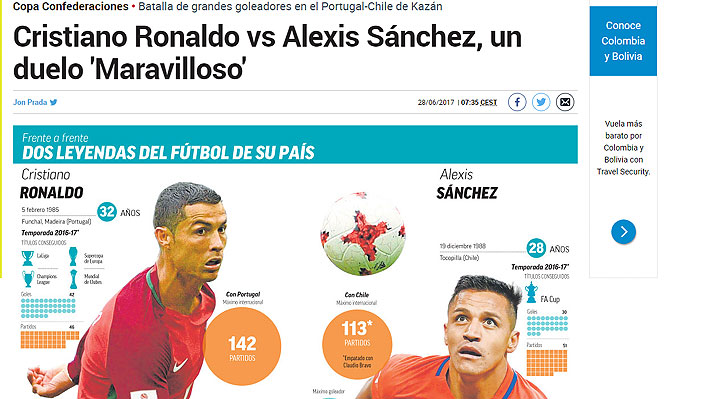 "En la Copa Confederaciones no hay delanteros tan voraces como Cristiano Ronaldo y Alexis Sánchez. Comparten dudas, capacidad goleadora y éxito con sus países. Chile viene de ganar dos Copas América seguidas y Portugal la Eurocopa. En Kazán, dirimirán un duelo por ser la gran estrella de la Confederaciones. Una batalla goleadora en busca de la final".