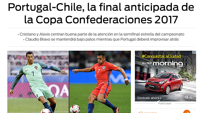 "Portugal-Chile, la final anticipada de la Copa Confederaciones 2017. Portugal y Chile acapararán este miércoles toda la atención del panorama futbolístico internacional. Con permiso del combinado germano, las selecciones participantes en el duelo de este miércoles han gozado -con justicia- del cartel de favoritas a lo largo de todo el campeonato. Una etiqueta merecida por el mero hecho de presentarse en tierras rusas con sus mejores hombres. Entre ellos, Cristiano Ronaldo y Alexis Sánchez. Las dos grandes figuras que contarán con una cota de protagonismo ineludible desde antes del pitido inicial".