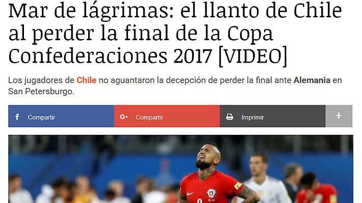 "Mar de lágrimas: el llanto de Chile al perder la final de la Copa Confederaciones 2017. Chile fue uno de los mejores equipos que hizo de esta Copa Confederaciones 2017 un torneo para recordar. Su juego ofensivo y presión sobre el rival generó aplausos, aunque en la final se encontró con un muro de Alemania que le ganó 1-0. Sin embargo, tendrían su revancha en un año cuando se juega el Mundial Rusia 2018".