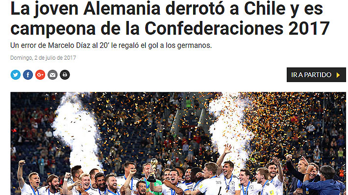 "Cuando Chile debía mostrar su experimentada estirpe y sus blasones como Bicampeón de América, y sobre todo cuando tenía contra la pared al campeón del mundo, un error de Marcelo Díaz a los 20 minutos de juego en la línea defensiva, permitió a Timo Werner ceder el esférico a Lars Stindl, que con la meta abierta y Claudio Bravo vencido, definió el único gol del encuentro. El conjunto de Juan Antonio Pizzi tuvo para abrir el marcador, pero su ineficacia frente al marco de Ter Stegen lo pagó muy caro, sobre todo al inicio del encuentro porque a través de Alexis Sánchez y Arturo Vidal, Chile tuvo para anotar, pero el acierto nunca estuvo de su lado y sí la imprecisión y las malas decisiones".