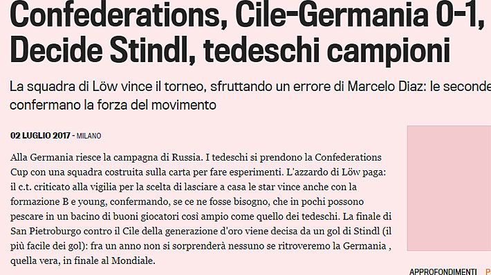 "Chile, después de una dramática semifinal con Portugal, decidió no tentar a la suerte y de inmediato se precipitó hacia adelante, con la esperanza de superar a la poderosa Alemania. Más sorprendente fue ver el único error de la defensa chilena que permitió que Stindl pusiera el 1-0".