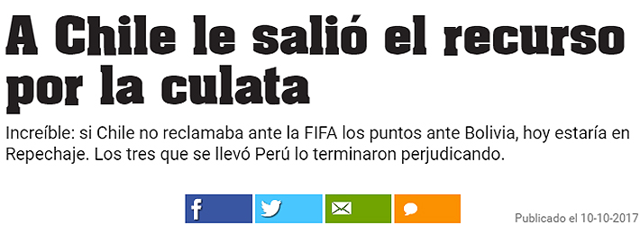 "A Chile le salió el recurso por la culata. Insólito lo que el pasa a Chile: el reclamo de puntos que realizó ante la FIFA tras el empate 0 a 0 ante Bolivia, en Santiago de Chile, lo dejó fuera del Mundial. Si la dirigencia trasandina obviaba el recurso legal, el equipo de Pizzi estaría planeando el Repechaje ante Nueva Zelanda, en lugar de Perú".