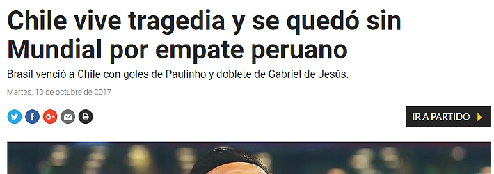 "Una auténtica tragedia vivió la Selección de Chile que ha quedado eliminado del Mundial de Rusia 2018 tras perder 3-0 contra Brasil en el Estadio de Palmeiras. La selección dirigida por Juan Antonio Pizzi llegó a la última jornada como segundo lugar de la eliminatoria con 26 puntos y con amplias posibilidades de clasificar pero, nunca descifró cómo hacerle daño a los cariocas".