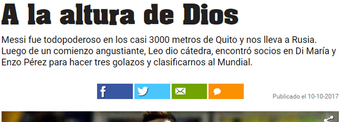 "El Messias. Cuando todo era tinieblas apareció la luz. Con tres goles y una actuación descomunal de Messi, Argentina se sobrepuso a un gol tempranero de Ecuador y se clasificó para el Mundial de Rusia".