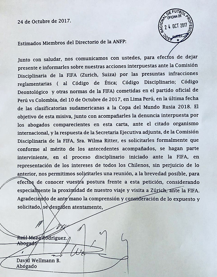 "El abogado Ángel Valencia nos manifestó la postura oficial del Directorio de la ANFP frente a este caso, manifestándonos que el tema se había debatido en una sesión del directorio concluyéndose que los hechos ocurridos en el partido de Perú y Colombia tenían el carácter de públicos y notorios, en consecuencia la FIFA estaba en pleno y total conocimiento de las eventuales infracciones reglamentarias, por lo que le correspondería actuar de oficio en este presunto caso de amaño de partidos", aseguró