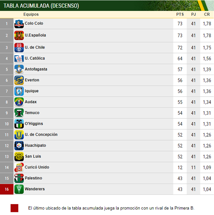 Pero no sólo el conjunto de colonia está luchando por no dejar la categoría, pues en esta pelea también se encuentran complicados en la tabla acumulada Santiago Wanderers y Curicó Unido.