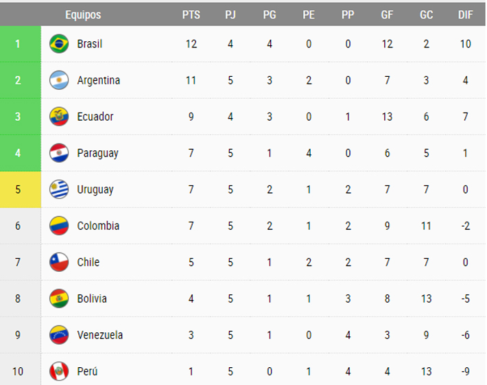 El líder Brasil frente a Ecuador que está tercero con 9, por lo que pase lo que pase en ese pleito, la "Roja" no se moverá de la séptima ubicación.