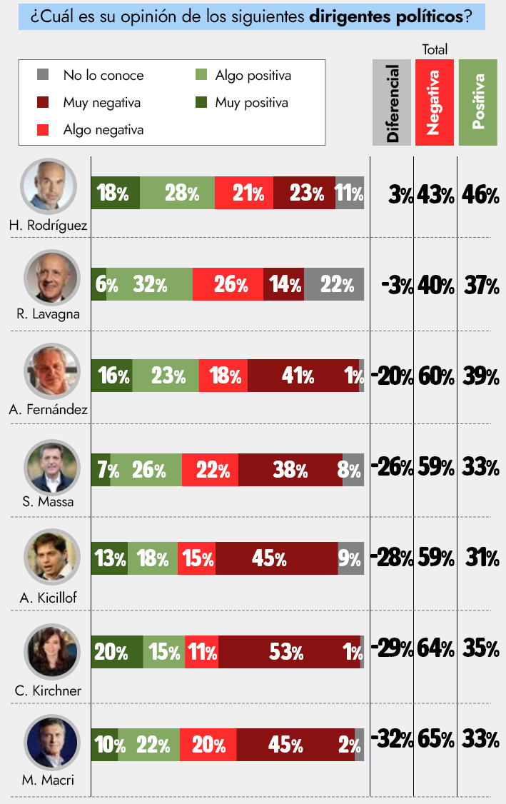 Por último, Cristina Kirchner y Mauricio Macri parecen cerrar la grieta en materia de imagen negativa. Ambos ex presidentes, emblemas y líderes de las dos principales coaliciones políticas a nivel nacional, siguen sumando rechazos. Según la encuesta de Opinaia, a la actual vicepresidenta la rechazan el 64% de los consultados, mientras que el 65% lo hacen cuando se menciona el nombre de Macri.