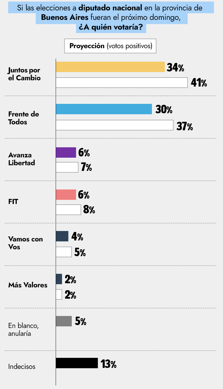 Según el estudio, realizado de manera online sobre 3.256 casos a nivel nacional entre el 15 y el 29 de octubre últimos, Juntos por el Cambio estaría alcanzando un 30% en todo el país, superando por unos seis puntos a la coalición gobernante Frente de Todos, que obtendría el 24%.