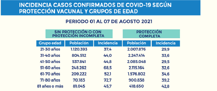"Podemos ver que en todo el grupo de edad las incidencias fue mayores en el grupo sin protección o con protección incompleta, comparados con aquellos con protección completa. Por ejemplo, de cada 100 mil personas entre 61 y 70 años sin protección o con protección incompleta 10 ingresaron a UCI, mientras que con protección completa solo ingresaron dos", manifestó.