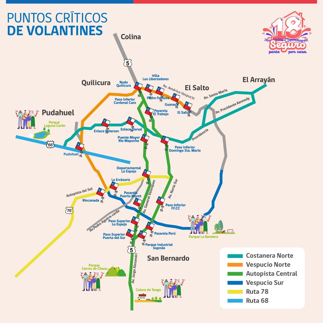 Las autoridades han identificado al menos 20 "puntos calientes" de riesgo de sufrir accidentes con volantines en la capital. "Son lugares donde han existido accidentes en años anteriores y que cumple con estas características: que hay un parque o un sitio eriazo que está muy cerca de la carretera y que la dirección del viento hace que cuando un volantín se corte quede dispuesto sobre la carretera, presentando un riesgo para todas aquellas personas que circulan en autopistas", explicó el subsecretario. (Ver gráfica al final)