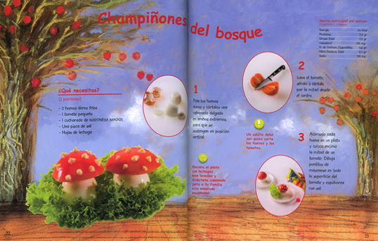 Lo otro interesante es que los nombres de las recetas apuestan a la imaginación de los niños como monstruos de pan; champiñones del bosque, payasos de piña, castillos de tomates y así.