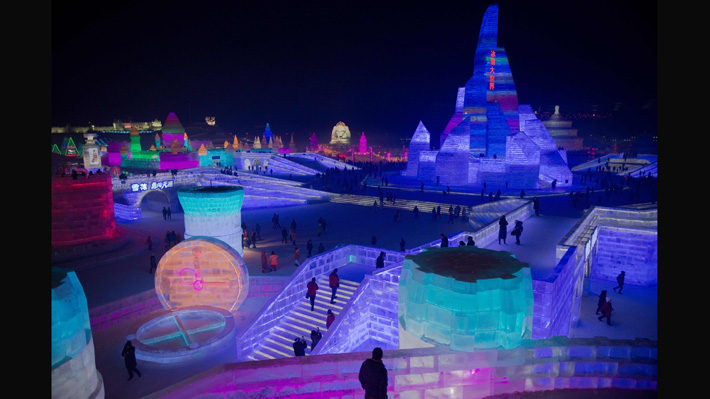 Las esculturas de hielo, repartidas por toda la ciudad y adornadas con luces de colores, atraen a millones de visitantes al evento que cada año celebra esta antigua colonia rusa.