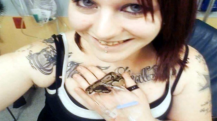 Ashley Glawe, de 17 años, fue al hospital con Bart, una pitón pequeña que se metió en el gran agujero que dejó un expansor en el lóbulo de su oreja.