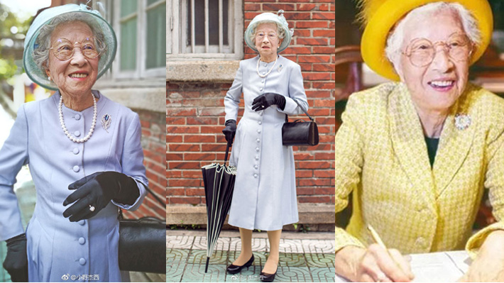 Zheng Suzhen, abuela de 15 nietos y 17 bisnietos, saltó a la fama luego de que el marido de una de sus bisnietas, el fotógrafo chino Ding Guoliang (31), publicara en Weibo –la red social más popular de China- las fotos de esta anciana vistiendo atuendos similares a los que luce Isabel II.
