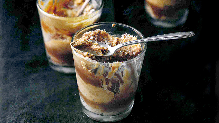 En un copón o fuente que pueda ir a la mesa (también puede hacerse el postre en copas individuales), poner una capa de galletas remojadas en leche o jugo de naranjas, luego una capa de manjar y finalmente crema de lúcuma. Repetir el proceso una vez, terminando con la crema de lúcuma. Se puede decorar con almendras laminadas tostadas o chocolate rallado.