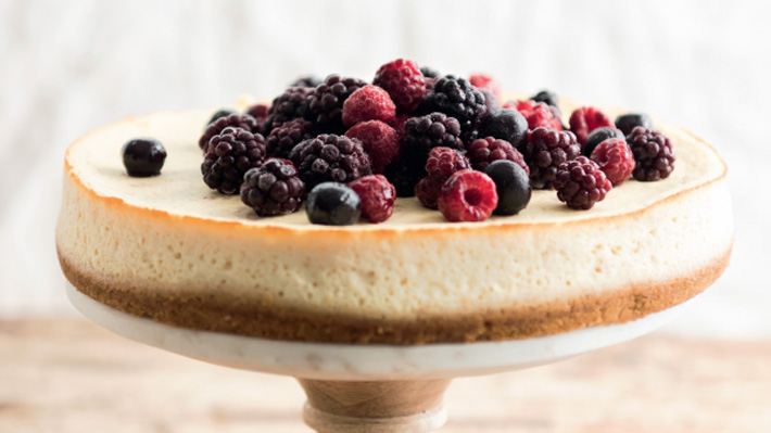 Mientras se hornea, pon un mix de tus berries favoritos en una olla pequeña con un buen chorro de maple syrup. Cuando empiece a salir jugo, lo apagas y luego lo retiras del calor. Una vez que salga del horno, espera que se enfríe y decora con tus berries endulzados.