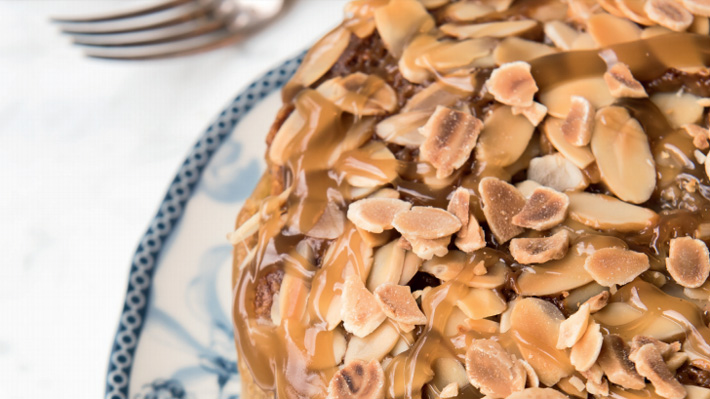 Decora con almendras laminadas y hornea por 60 a 70 minutos aproximadamente. Deja descansar el bizcocho en el molde por 30 minutos antes de desmontar.