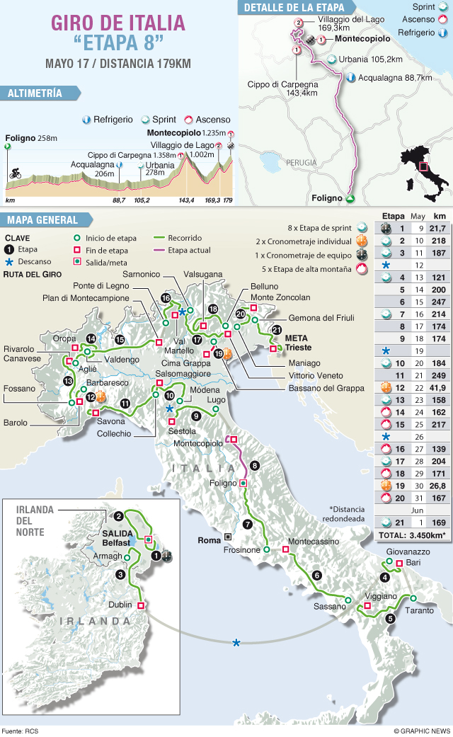 Este sábado se disputará la octava jornada, de 179 kilómetros entre Foligno y Montecopiolo, donde los líderes y buenos escaladores podrán mostrar sus virtudes y credenciales que los hacen en teoría favoritos al triunfo final.