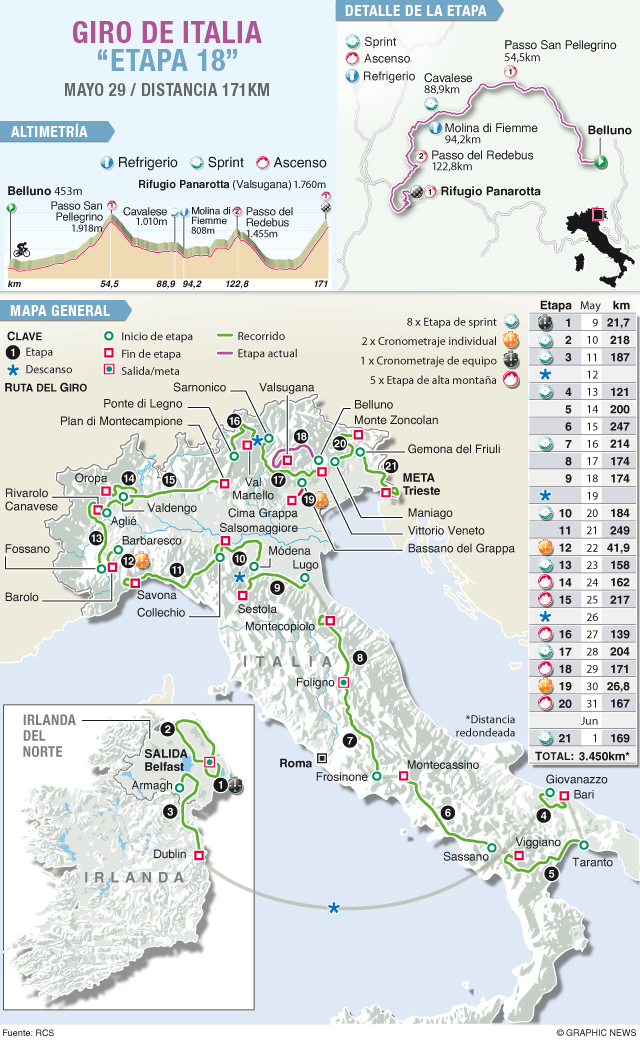 Este jueves se disputará la decimoctava etapa, entre Belluno y Panarotta, con un recorrido de 171 kilómetros y donde Quintana tendrá la oportunidad de extender su ventaja, pues la jornada contempla tres ascensos (dos de primera categoría y uno de segunda). El último de ellos tiene 17 kilómetros y precisamente en su alto está ubicada la meta.