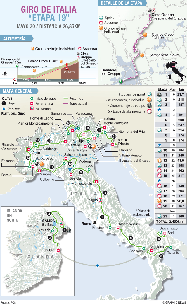 El Giro, no obstante, aún reserva dos jornadas definitorias, donde otra vez los ascensos marcarán las diferencias. Este viernes se disputará la decimonovena etapa, en la modalidad de contrarreloj individual, entre Bassano del Grappa y Cima Grappa, con un recorrido de 26,8 kilómetros, y donde los últimos 17,8 kilómetros son en subida, hasta coronar los 1.712 metros sobre el nivel del mar.