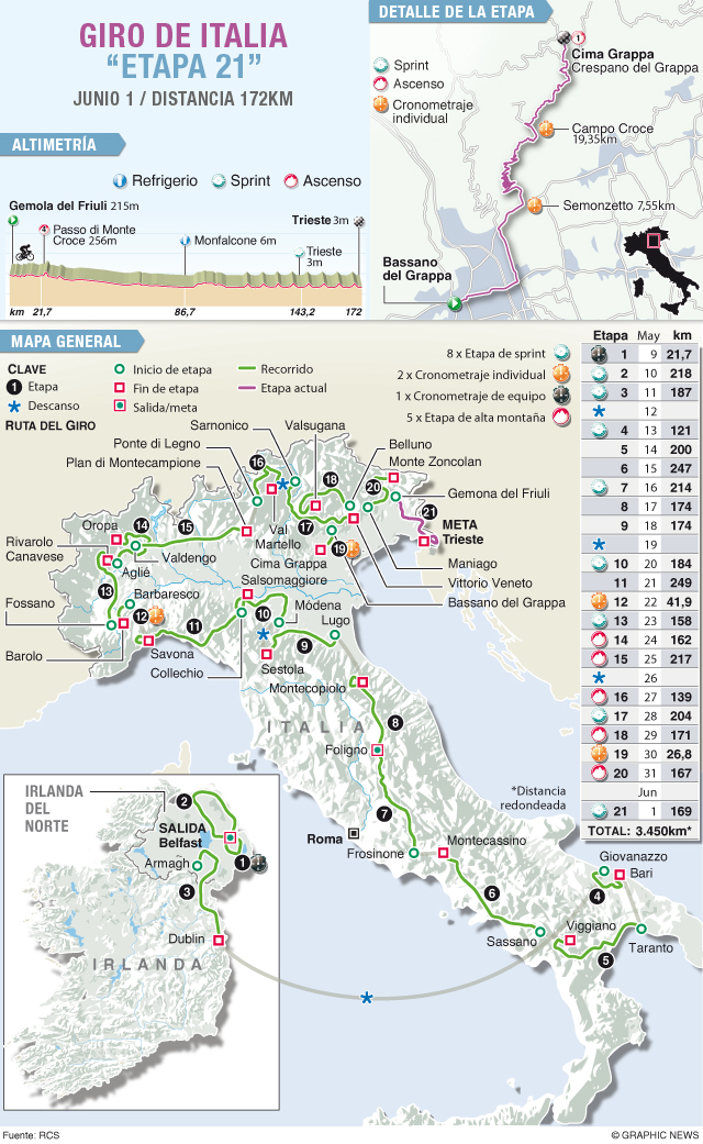 Este domingo se disputarán los últimos 169 kilómetros, un "paseo" con salida en Gemona y llegada en Trieste, donde estará ubicada la última pancarta del Giro 2014. Y donde se firmará la gloria para Quintana, Urán y el ciclismo colombiano.