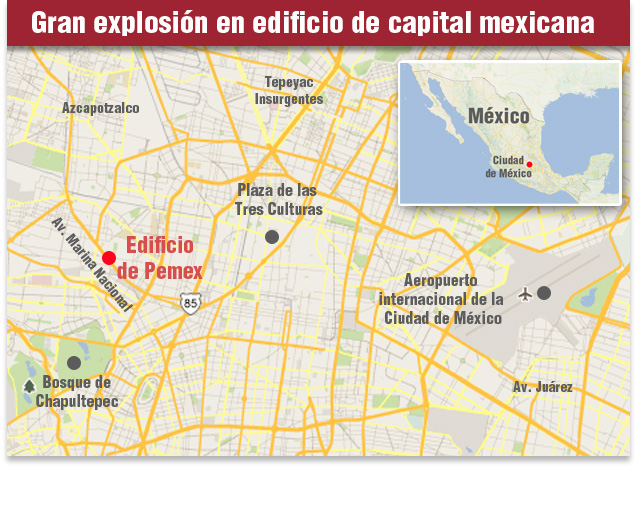 MÉXICO.- Una explosión sacudió este jueves un edificio del complejo administrativo central de la empresa Petróleos Mexicanos (Pemex) en la capital mexicana. La cifra de muertos ha crecido constantemente conforme pasan las horas y llega a 25 personas hasta ahora.