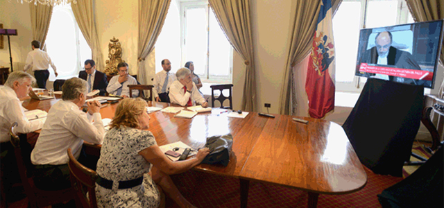 12:18.- En La Moneda, Sebastián Piñera sigue atentamente la lectura del fallo, desde el comedor presidencial, donde está acompañado por su señora, Cecilia Morel, y los ministros Alfredo Moreno, Felipe Larraín y Cecilia Pérez.