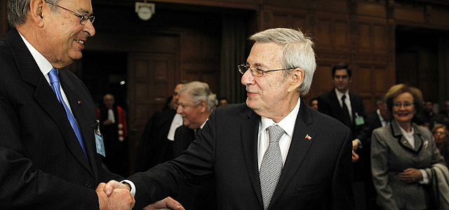 10:48.- Los jueces ad hoc de la Corte, el francés Gilbert Guillaume y el chileno Francisco Orrego Vicuña ya se encuentran al interior del Palacio de la Paz en La Haya.