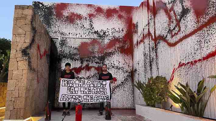 Tres activistas arrojaron pintura roja y negra sobre la fachada de la casa de Messi en Ibiza para denunciar la responsabilidad de "los ricos" en la crisis climática.
