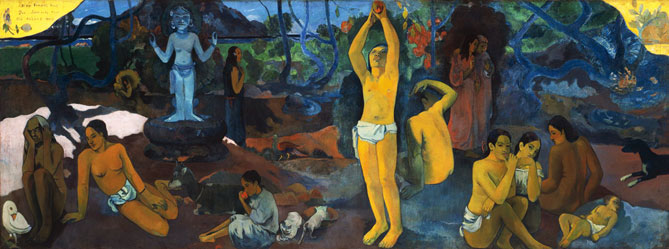 De formato horizontal, la pintura sigue una evolución cronológica inversa. A la izquierda vemos a una decrépita momia que en estado fetal tapa sus oídos, mientras que a la derecha un inocente bebé es cuidado por tres bellas tahitianas, y en el centro un hombre recoge una fruta, simbolizando la tentación y su eventual caída. Una interpretación de la trayectoria del hombre vista por el artista quien, desesperanzado y lleno de dolor, ha renegado de Dios, pero sin embargo es capaz de crear algo extraordinario que nos invita a reflexionar profundamente sobre las inquietudes fundamentales de todo ser humano.
