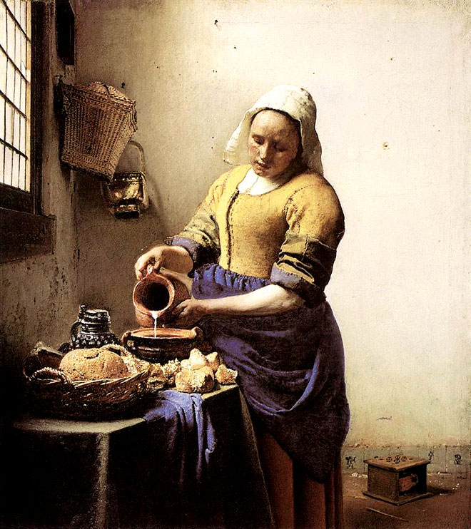En la pintura "La lechera", Vermeer captura una típica escena doméstica. Una mujer en una habitación vertiendo un jarro de leche, una ventana a la izquierda por donde entra la luz, una mesa con objetos y alimentos, y el muro del fondo vacío, excepto por un par de canastos que sirven para almacenamiento y cuelgan de un rincón.